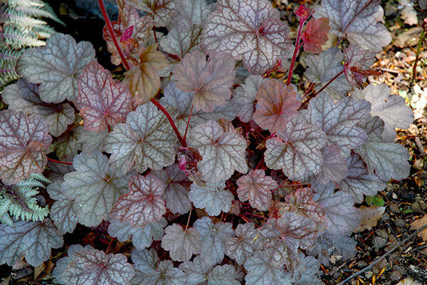 Листва. Листовые пластины гейхеры крупные до 13 см в диаметре, округло-сердцевидной формы с резными краями, они расположены на длинных черешках. С внешней стороны листья окрашены в серебристо-серый цвет с лавандовым отливом, с изнанки – в бордово-лиловый. Жилкование ажурное, темно-зеленого оттенка.