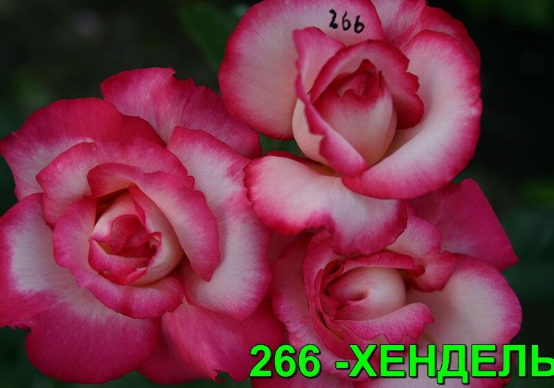 Цветки средних размеров, с высоким центром, хорошо сложены, почти махровые, кремово-белые с розовой окантовкой по краю лепестков. К сожалению, почти не пахнет. Повторное цветение гораздо слабее первого. Выносливый и холодостойкий сорт, хотя подвержен черной пятнистости.