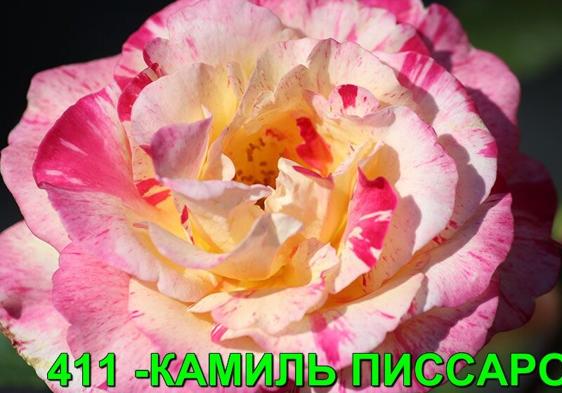 Крупные цветки покрыты алыми, розовыми, желтыми и белыми мазками. Листва темно-зеленая. Цветки крупные, в кистях, пахнут яблоками и розовым маслом.