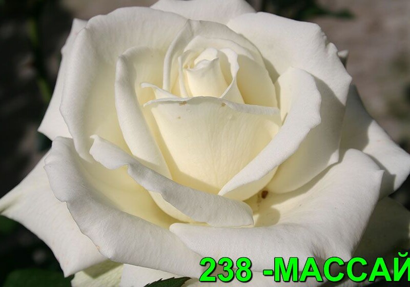 Роза Массай белая, снизу зеленоватая, бокаловидный цветок. Бокал высокий, гофрированный, махровый (лепестков более 60 шт). Обладает легким ароматом. Лист тёмный. Цветение повторное. Устойчивость к заболеваниям высока.