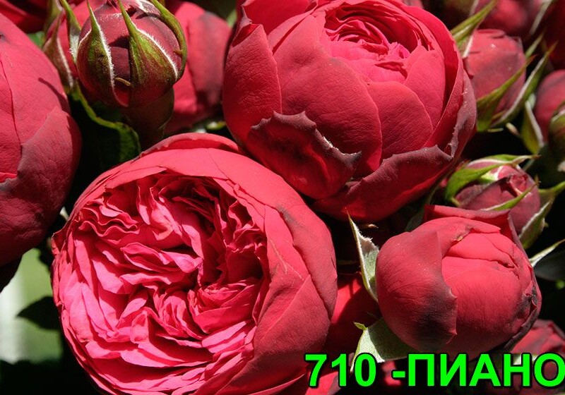 Piano – чайно-гибридная роза с ностальгическими ярко-красными крупными цветками. Цвет очень яркий, светящийся, цветки вначале шаровидные, позднее чашевиные, с плотно набитой серединкой. Аромат легкий. Листва очень блестящая, устойчивая к болезням. Цветет до поздней осени.