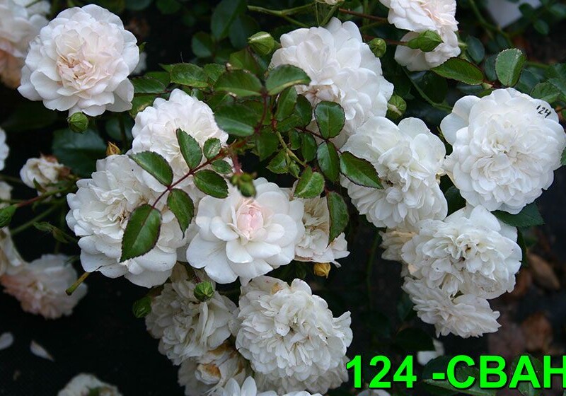 Цветки чистого белого цвета, с нежно-розовым тоном в центре, когда только распустятся, густомахровые, в форме розеток. Появляются в кистях по 5-20 шт на довольно длинных стеблях. Листва очень красивая, темно-зеленая, мелкая, блестящая, вечнозеленая. Форма куста выгодно смотрится при посадке на склоне. Можно использовать как невысокую плетистую розу.
