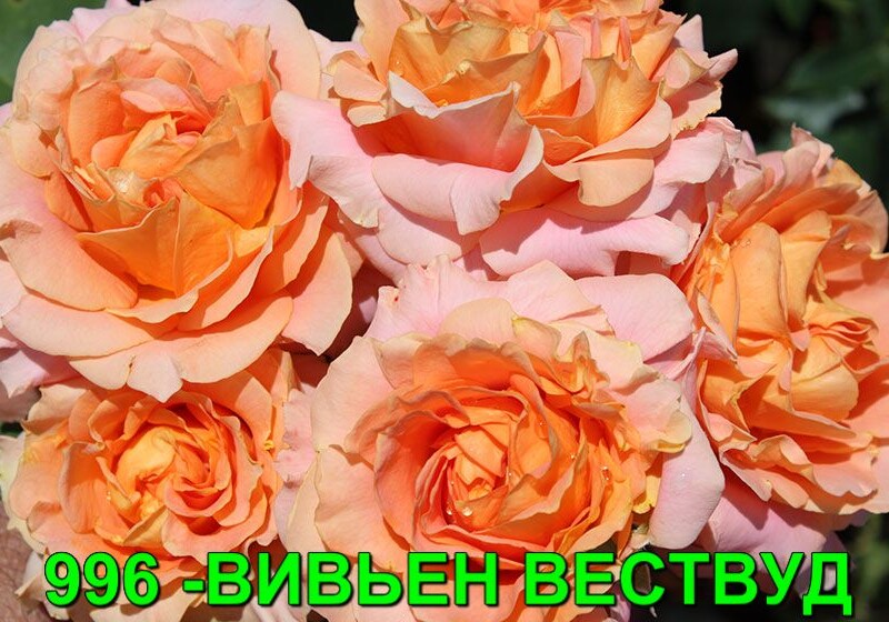 Вивьен Вествуд - британский дизайнер, основательница стиля панк в моде. Махровые, элегантные цветы необычного окраса. Цвет абрикоса, лосося, оранжевого и розового, постепенно смешиваются и переходят друг в друга Осенью, цвета становятся ярче и ярче. Листва темно-зеленая, глянцевая.